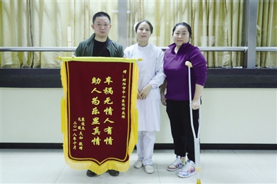10月25日,伤未痊愈的仇璇在丈夫的搀扶下,拄着拐杖来到市中心医院门诊部,亲手将锦旗送到了许燕晖的手中,以表达内心的感激。