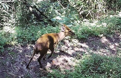 小麂:一种小型的鹿科动物,栖息在稠密灌丛中。小麂头部为鲜棕色,体毛呈棕褐色,颈背部较深,呈暗褐色,腹面从前胸至肛门周围均为白色。取食多种灌木和草本植物的枝叶、幼芽,也吃花和果实。喜独居或雌雄同栖。主要分布于中国的亚热带地区。