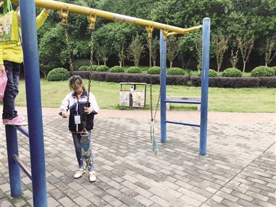 11月13日,记者在长胜公园看到,这里安设了许多健身器材,但大多数健身器材存在不同程度的损毁,或锈迹斑斑,或“缺胳膊短腿”。最严重的是,秋千座椅已经完全断裂,两根秋千钢绳被栓系在一起。有小朋友竟然踩在钢绳搭建的“座椅”上荡秋千,看起来令人揪心。