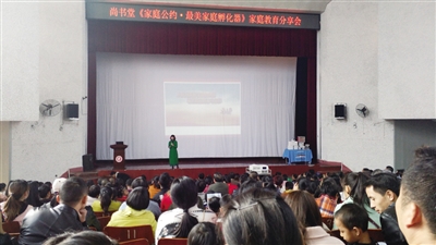 本报讯 “你系统地学过家庭教育课吗?”“你了解自己的孩子吗?”“如何打造幸福家庭?”……11月10日下午,由尚书堂教育培训学校主办、湖南乐道文体有限公司协办的《家庭公约·最美家庭孵化器》家庭教育分享会在衡阳师范学院西校区礼堂举行。国家注册心理咨询师、省教育厅关工委家庭教育宣讲师张晓阳女士给广大家长送来“幸福家庭秘笈”:用《家庭公约》“孵化”幸福家庭。