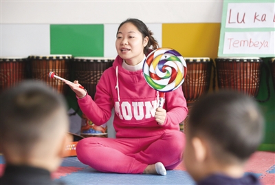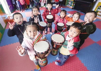 创意美术教育是该园一直坚持的特色教育。不仅如此,今年该园还引进了奥尔夫音乐教学,将语言、歌唱、律动、乐器、集体舞蹈各领域融为一体,让孩子们在和谐的环境中探索、体验、表演创作音乐。在中班幼儿音乐教学中,老师采用动静结合法,一方面,在课堂上,引导幼儿欣赏多媒体动画歌曲,现场观看教师演奏乐器;另一方面,利用课余时间,精心编排韵律舞蹈,在户外通过伴奏音乐、教师示范等方式,带领幼儿在旋律的变换中,时而整齐有序地变换队形,时而积极与同伴互动,感受全身运动带来的快乐。“一动一静交替的音乐教学法,有助于塑造幼儿张弛有度的性格。”