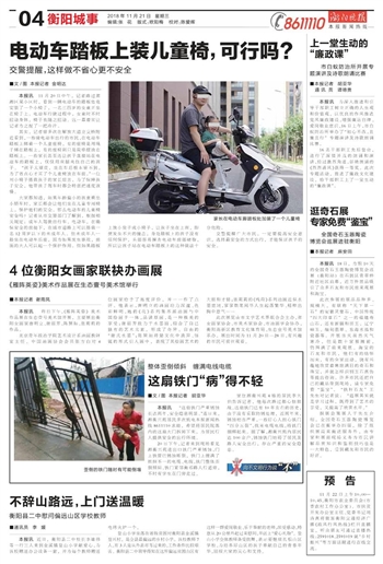 本报讯 11月20日中午,记者路过蒸湘区某小区时,看到一辆电动车的踏板处竟安装了一个小椅子,一名三四岁的女童正坐在椅子上。电动车行驶过程中,女童时不时扭动身体,椅子也随之扭动。这一幕着实让记者为之捏了一把冷汗。
