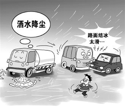 2.寒冷天气下洒水作业事关公共安全,不可麻痹大意,一旦发生意外,洒水方轻则要承担民事赔偿责任,重则可能涉及犯罪问题。在有严格的执行标准的情况下,环卫部门冬季洒水作业还有“失手”的时候,其他部门或单位犯错的概率无疑更大。根据气温变化对路面进行清洗是常识,但有些单位连常识都没有,机械地进行洒水降尘作业。