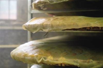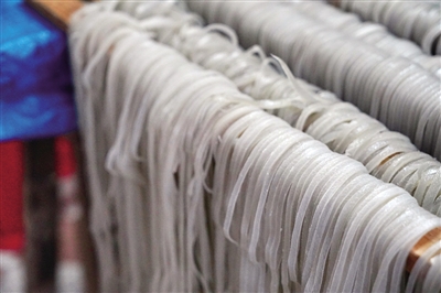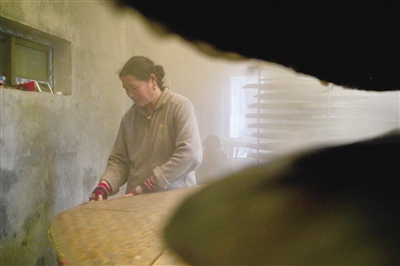 在耒阳市太平圩乡凤光村,制作红薯粉皮是家家户户都精通的传统手艺。1月14日,凤光村村民周珍运和丈夫正忙着红薯粉皮的蒸制拉薄。记者一行亲眼见证了红薯淀粉的升级转化:舀一瓢红薯淀粉放在蒸锅的锡盘里蒸几分钟,蒸熟后把锡盘取出,将粉皮铺在簸箕背面,再凭手法的张力均匀把粉皮往四周拉,使粉皮块越拉越薄,然后放在旁边的格子架上搁置几分钟。晾到半干时取下来叠在一起,用机器均匀切成粉条。阴雨天气时,架在房间里用炭火烤干;如果天气晴好,搬到外面晒干即可。