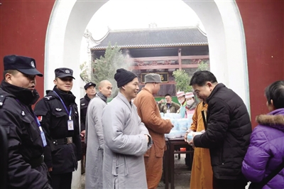 1月13日是农历腊月初八,当天上午,“逛千年庙会、品温暖腊八”2019年南岳庙会启动仪式暨腊八节慈善活动在南岳大庙举行。市公安局南岳分局提早谋划,科学部署,安排警力守护平安,现场秩序井然。 文泽荣 摄