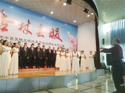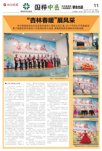 文艺汇演在院长王诚喜热情洋溢的致辞中拉开帷幕。王诚喜院长说,40年的奋斗,中医旗帜高高飘扬。1982年,国家卫生部在我市召开了“衡阳会议”,这是新中国成立以来首次召开的全国中医医院和高等中医院校建设工作会议。会议明确提出了要“突出中医药特色,发挥中医药优势,发展中医药事业”,强化了“中医、西医、中西结合三支力量大力发展,长期并存”的基本方针,对我国中医药事业的发展具有深远影响和里程碑意义,这是“艰难的历程、光辉的成就、历史性的贡献”。