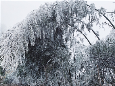 近日,受强冷空气影响,衡阳不少高寒地区出现雨凇雾凇景观。在祁东县四明山国家森林公园主峰腾云岭上,轻盈洁白的雾凇附着在树木、山石上,琼树银花,冰雕玉砌,将云雾中的腾云岭带入令人神往的冰雪世界。 本报记者 张志伟 摄