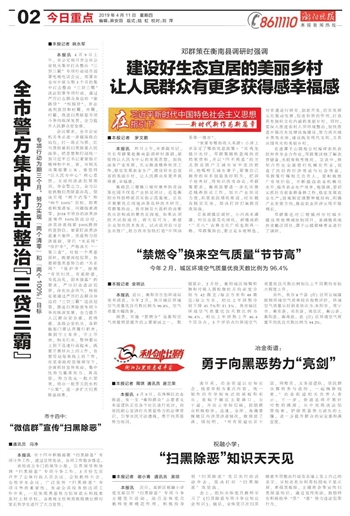 本报讯 近日,衡阳市生态环境局发布消息,今年2月,我市城区环境空气质量优良天数比例为96.4%,空气质量大幅改善。