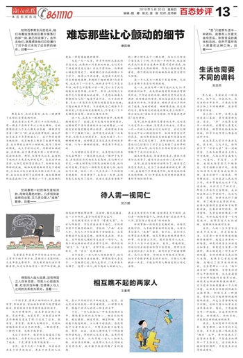 其实,生活需要不同的调料。改变那种一成不变的平淡生活,并不是主张一味地泡在“糖水”之中,要知道泡久了容易滋生毒素。只能适当地调剂一下生活方式,适当地加点酸和苦的调料,才能使生活过得有滋有味。