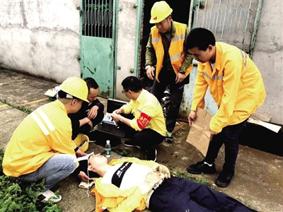 近日,广铁工务大修段衡阳焊轨车间组织职工开展高温时段作业人员中暑应急演练。同时,针对野外施工驻地毒蛇出没等情况,模拟实施了人员被毒蛇咬伤后的紧急救护演练。图为模拟职工被毒蛇咬伤后安全救护时的情景。 通讯员 邓姗姗 陈志清 摄