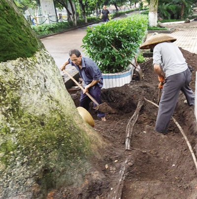 5日下午,在岳屏公园西南侧主游道旁大坪内,记者看见坪内10余株大树树围下,四周新辟掘挖出一道道约70公分深的方形坑洞,手腕粗的树根显露出来,不少树木被截枝修剪。施工人员正冒雨往坑洞内填充肥料、泥炭及黄泥。