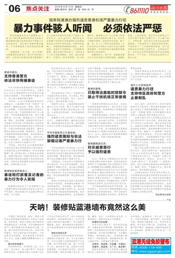 声明说,在13日香港国际机场的非法集会中,示威者撕下所谓“和理非”的假面具,瘫痪机场运作,阻碍、辱骂、攻击不同国籍、不同性别的旅客乃至患病人士和无辜小童,严重侵害他们的正当人身权利,严重影响香港国际声誉。更令人愤慨的是,13日晚,极端暴力分子采取围堵、搜身、非法禁锢、野蛮殴打等手法对待现场正常采访的《环球时报》记者和持因私合法证件途经香港机场送人的深圳居民,并袭击到场协助护送的警员。暴徒对新闻记者的非法禁锢、野蛮殴打,更是对全球新闻界的挑战和侮辱,是对新闻自由的严重践踏。这些目无法纪、侵犯人权、泯灭人性的暴行,完全超出文明社会的底线,已经与恐怖分子的暴行无异。