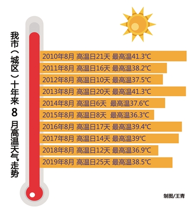 本报讯 9月3日,记者从市气象局获悉,刚刚过去的8月,是十年来高温日(日最高温度大于或等于35℃)天数最多的一年,有25天。