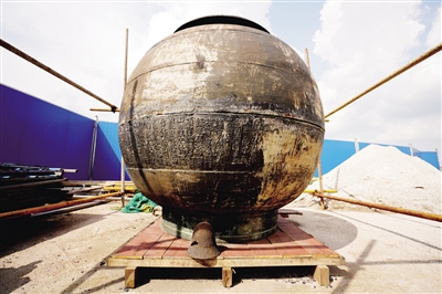在来雁塔的修缮过程中,文物专家对来雁塔塔刹进行实地勘察,发现塔刹已经歪闪,刹体、刹座为铸铁构件且锈蚀严重。塔刹构件中,仅有青铜大宝瓶保存完好,结构为两个半球体,表面铸有“皇明万历十九年”等内容的铭文,确定为明代原件。