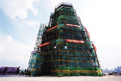 本报讯 昨日,记者从湖南华侨城获悉,备受瞩目的来雁塔修缮工程取得重要进展:在更换了部分破损构件后,施工方重新将塔刹吊装至塔顶,并全面完成铜制拉链的固定及塔顶瓦面铺设等后续工作。