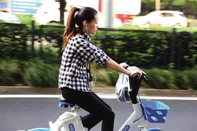 9月24日下午5点,在华新步步高商场前门,市民谢小姐刚健身完,准备骑上公共自行车回家。“开车难找停车位,还要耗油,骑这个车低碳环保。”她笑着跟记者说道。