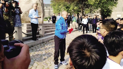 当日9时许,正源学校北京励志行的师生来到八达岭长城脚下的大坪外,只见几位扛着摄像机的记者正在坪内采访一群人。“光头刘Sir!”正源学校校长助理蒋智敏惊奇地叫了起来。“刘Sir,我们挺你!”蒋智敏情不自禁地大喊了一声。没想到,“光头刘Sir”听后立即回过头挥手致意!师生们喜出望外,立即齐声高呼:“刘Sir,我们挺你!”刘泽基听到后立即挥手跑向师生们:“你们好!谢谢你们!谢谢你们!”他站在护栏前,亲切地问同学们上几年级,是哪所学校的。同学们告诉他,他们是湖南耒阳市正源学校高一的学生。“谢谢你们!”刘泽基双手合掌一个劲地表示感谢,并不忘叮嘱同学们好好学习。随后,他主动与师生们一起合影留念。