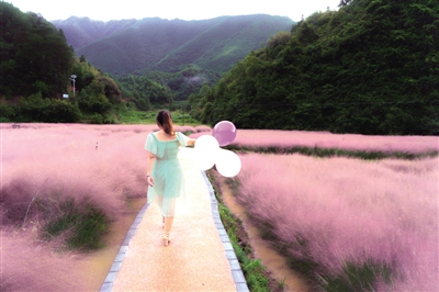 桐子坳景区80亩粉黛乱子草,远看如红色云雾,仙气十足,呈现出浩瀚如烟的粉红海洋。粉黛乱子草又名毛芒乱子草,系多年生暖季型草本植物,花期8月至11月,花穗呈云雾状,随着白天到傍晚光线和色温的不同,花穗会呈现出不同的色彩,视觉冲击力极强。