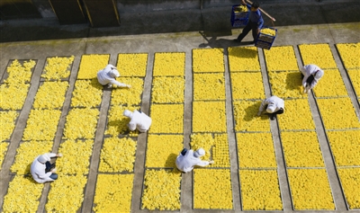 11月3日,南岳区寿岳乡岳林村贵妃凰菊基地的600余亩高山凰菊在金秋的艳阳里争奇斗艳,农民抢抓晴好天气采摘、晾晒、加工,游人们在花丛中游玩、拍照、嬉戏。怒放的菊花、收获的喜悦和游人的笑脸,交织成一幅大山深处的灿烂画卷。 尹中宝 摄