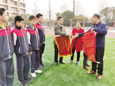 本报讯 “我谨代表我们全家衷心感谢贵校4名学生的热心帮助……”11月4日,在华新实验中学升旗仪式上,衡南县三塘镇村民高青英一家三口给该校华凌志等4名同学送来感谢信和锦旗。