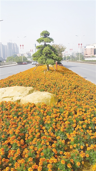 4日下午,记者在衡州大道万达广场路段看见,多款鲜花绣织而成的花卉景观宛如一块巨大的花毯铺设在道路中央。除了连片金黄的孔雀草之外,还栽植有一串红、凤尾及矮牵牛等多款红色系列花卉。眼下,衡州大道园林绿化“秋装”已进入最佳观赏期。除万达广场路段外,我市还精心绣花布景,打造了光明立交桥匝道、市体育中心等路段园林景点,担纲花景主角的7万余盆俏美孔雀草分为黄色、金黄色等,目前正值盛花期。市园林绿化服务中心有关负责人表示,今后,我市将精选四季特色花卉,通过点线面结合,绣织出不同规模、特色各异的主题花景,突出花开成片、色彩鲜明的高品质城市道路园林景观,努力将衡州大道园林景观打造成城市的“花名片”。