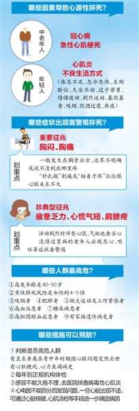 济南市急救中心副主任王少平表示,心源性猝死一般是由心脏骤停引起的,而心脏骤停则可能由于心肌梗塞、室颤、心律失常以及冠心病、心绞痛等病症引起。