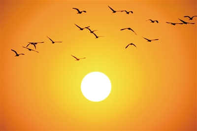 12月13日,珠晖区白鹭湖上空,夕阳下,白鹭逐日的场景美如画。近年来,我市生态环境持续改善,优良的自然环境成为各类鸟类栖居的乐园。