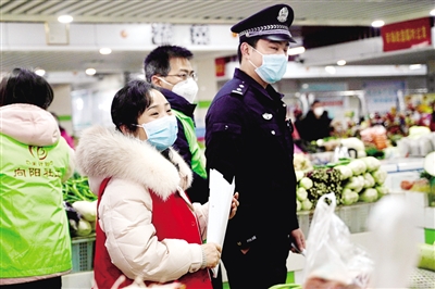 2月4日,石鼓区人民街道向阳社区工作人员来到农贸市场,对市场摊主开展疫情防控宣传。 张志伟 摄