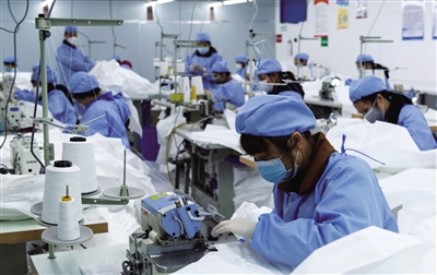 2月5日,在湖南永霏特种防护用品有限公司,工作人员在赶制医用防护服。位于湖南湘潭高新区的湖南永霏特种防护用品有限公司此前一直生产非医用防护服,新型冠状病毒感染的肺炎疫情发生后,该企业通过湖南省药品监管局绿色应急通道检测、审批,获得了医用防护服的生产资质,预计可日产3000套,助力新型冠状病毒感染的肺炎疫情防控。
