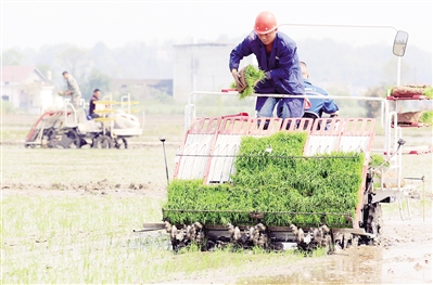 4月8日,在衡山县白果镇绍庄村,农机驾驶员驾驶抛秧机在进行机械化抛秧。 当地农民抢抓农时进行早稻的耕种,田间一派忙碌的春耕生产景象。衡山县把水稻生产全程机械化工作作为粮食生产的重要抓手,出台了稳面积稳产量的种粮、购机奖补措施,提高了农民的种粮积极性。
