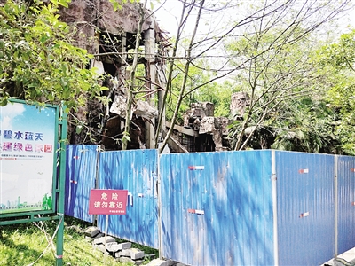 本报讯 随着天气转晴,前来平湖公园游玩、锻炼的市民越来越多。但昨日有市民向记者报料,称平湖公园北侧有两处假山发生了坍塌,存在严重的安全隐患,希望相关部门尽快维修。