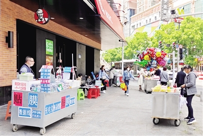 13日下午,解放路与中山南路交会处西侧路段,记者看见人行道两侧被挨肩并列的摊担占满,以水果摊担居多,粗略计数,50米长环形人行道“挤”进了10个摊担。不仅妨碍路人通行,而且严重影响市容市貌。 ■本报记者 胡亚华 摄