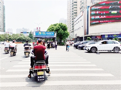 当日11时许,记者来到高新区步步高广场路口人行横道附近。此时,来往的机动车、非机动车和行人非常多。记者发现骑自行车、电动车的市民在等红绿信号灯时,大多骑在车上等候,绿灯亮起便直接骑车快速通过,并没有人下车推行,有的电动车驾驶员甚至加大油门,在行人间穿梭。