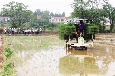 本报讯 5月10日,大型犁田拖拉机、耕田机、插秧机、抛秧机、收割机,还有喷洒无人机,一样样最新式的农机产品,竞相亮相耒阳市马水镇桃花村田野。这让前来观摩的一百多名农民参观团成员称赞不已,也让这些种粮大户感受到了科技农业的魅力。