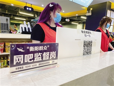 在网吧样板点参观中,记者看到,网吧的LED显示屏、门口显眼处均有文明宣传标语,创建氛围浓厚。网吧收银台工作人员对前来上网的顾客进行体温测试,并要求其进行信息登记。在收银台上还有“衡阳群众”网吧监督岗的标志牌。