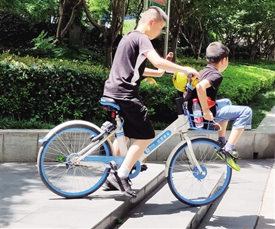 14日下午,记者看见一个大男孩骑着一辆共享单车,车筐内坐着一个小男孩,车把手中间放置着一只皮球,大男孩右手握着龙头,左手拿着冰棒,一边骑行,一边吃冰棒,小男孩则双腿悬空坐在车筐内。当车辆行至上下台阶处时,小男孩并未下车,而是双手紧抓车筐,下了台阶后,单车一头驶入人行道,过往路人纷纷绕道避让。“共享单车车筐均标注最大承重量5千克,‘请勿载人’等警示语”。广场管理所有关负责人介绍称,车辆在转弯、急刹时,孩子均有可能从车筐内摔出,存在安全隐患。