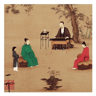 《听琴图》的背景简洁,作品构图虽然简净,但人物举止形貌刻画生动传神,主人公道冠玄袍,居中端坐,凝神抚琴,前面坐墩上两位纱帽官服的朝士对坐聆听,悠然入定,仿佛正被这鼓动的琴弦撩动着神思,完全陶醉在琴声之中,营造出了一种清幽的氛围。可以说,《听琴图》通过对背景的刻画突出了主人公优雅的气质,属于高端“滤镜”。