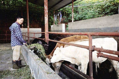 在衡阳市浩宇种养合作社肉牛繁育基地里,村民朱喜强正推着搅拌好的草料喂牛、打扫牛舍。“我在这里工作6年了,每天打扫卫生、养牛、喂牛。”朱喜强说。