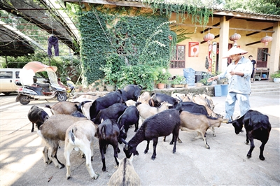近日,走进光辉村,记着正好看见了这样一幅美丽的乡村放牧图:朝阳下,只见一个村民赶着一群山羊,朝着叠青泻翠的山头走去。