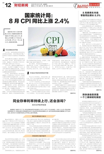 国家统计局: 8月CPI同比上涨2.4%