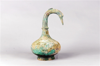 鹅首曲颈青铜壶出自三门峡后川村古墓群。经考古人员实测,其所在的古墓年代为西汉初年,墓主人应是位身高1.8米左右的男子。男子墓葬还出土铜器、玉器、陶器、铁器等。其中,铜器有铜镜、铜印、铜盆、铜饰品等,铁剑配有由4块玉饰物组成的玉剑具。“有宝剑,说明是武士。有铜镜、铜饰品,说明爱美。加之鹅壶内盛有美酒,墓主人应该是位追求生活品质的‘优质男’。”郑立超说。