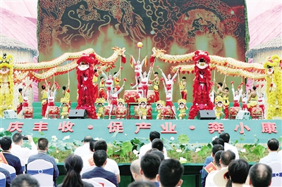9月19日,衡阳市2020·中国农民丰收节在石鼓区角山镇利民村举行。上千名游客和当地农民欢聚一堂,庆丰收,迎小康。图为大型歌舞《丰收鼓舞》,擂响了石鼓区大力发展都市农业、全力促进农民增收的奋进“鼓点”。罗盟 摄 |