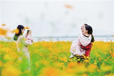 9月24日,衡东县新塘镇石杨村,衡东县氵米水国家湿地公园河滩上播种的向日葵、波斯菊等上百亩花卉大量盛开,其他相关品种花卉将在国庆期间进入盛花期,预计花期将持续到11月中旬。