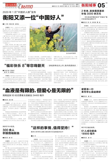 受疫情影响,2020年1月“中国好人榜”延迟至9月27日发布,经地方推荐、集中展示、网友点赞评议,湖南共有3人荣登榜单。其中,衡阳富强果业专业合作社理事长邓满秀当选为诚实守信类“中国好人”。