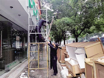 8点,经城管执法队员现场勘查,发现这家门店在人行道上随意搭建脚手架,倾倒柜子、木板等装修垃圾,未及时清理。城管执法队员当场拆除了这家门店在人行道上搭建的脚手架,责令门店业主自行清理倾倒的垃圾,并通知当事人到大队接受调查。