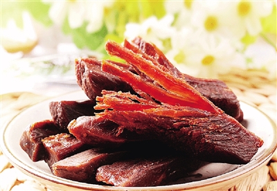 制作方法:牛肉洗净切小条,将胡椒、荜茇、陈皮、草果、砂仁、高良姜等6味药研成末,加入姜汁、葱汁、食盐与牛肉相合拌匀,放入坛内,封口,腌制2日后取出,再放入烤炉中烤熟即可食用。