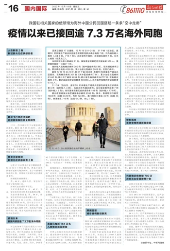 外交部领事司司长崔爱民17日在2020年度领事工作媒体吹风会上说,疫情以来,我们先后派出14架次包机和临时航班,从泰国、马来西亚、日本等国接回湖北籍居民1887人。除了商业航班不断航,已安排351架次航班,从意大利、英国、美国、南非、伊朗等92个国家接回超过7.3万名同胞。此外,还协助香港特区政府,从日本接回195名“钻石公主”号邮轮上的港澳同胞。