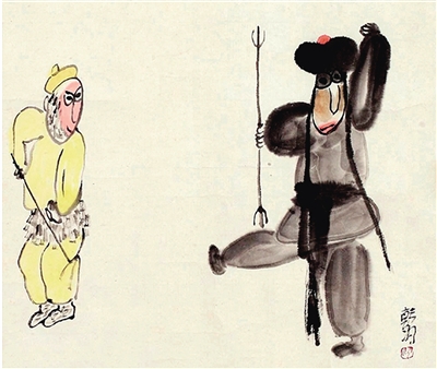 水墨漫画家应尽可能地掌握多种人物造型手法,应根据内容选择相适合的人物造型,或写意大夸张、或工笔细致刻画、或兼工兼写。中国老一辈水墨漫画家韩羽先生,把中国国粹京剧人物与现实生活相结合,把大写意与漫画人物造型相结合,其笔下的人物诸葛亮、关羽、武松等朴拙而不失飘逸,粗犷而不失细腻,辅以出色的文笔,以诗情配画意,妙不可言。方成先生的人物造型则注重人物性格的刻画,线条苍劲有力,以相对写实的风格,惟妙惟肖地塑造了梁山好汉鲁智深、李逵以及钟馗等人豪爽耿直的性格,独树一帜。徐鹏飞先生的水墨人物,造型则更加简练概括、轻松潇洒。题材更加广泛:历史典故、神话传说、民间故事、歇后语等包罗万象,配之以打油诗,趣味盎然,散发着浓浓的文人画气息。