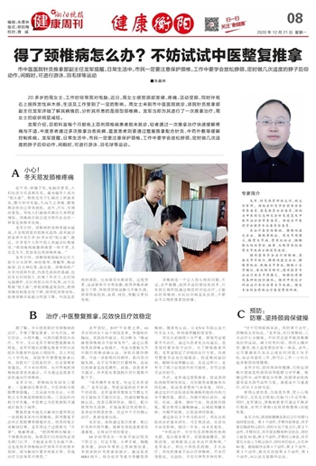 ~~~市中医医院针灸推拿部副主任龙军提醒,日常生活中,市民一定要注意保护颈椎,工作中要学会放松脖颈,定时做几次适度的脖子后仰动作,闲暇时,可进行游泳、羽毛球等运动