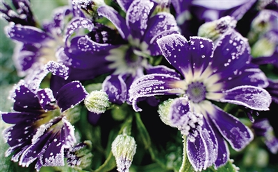 1月18日清晨,衡阳城区出现霜冻现象。因清晨空气相对湿度较大,公园及绿化带内的植物披上了一层白霜,在朝阳的映照下,凝结白霜的景观花朵晶莹剔透,别样美丽。■张志伟 摄